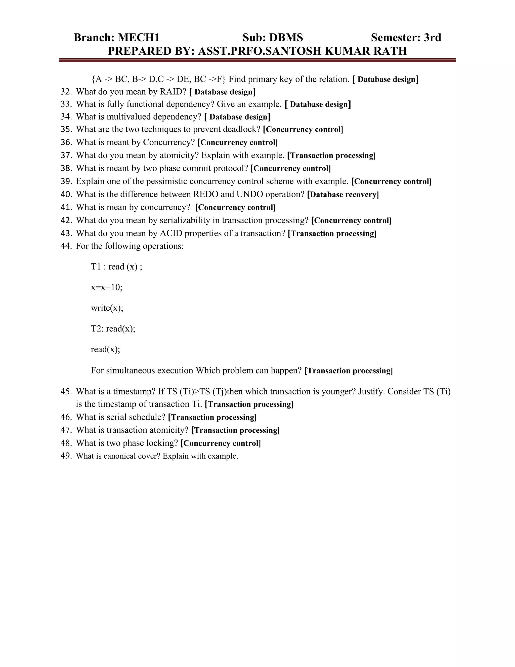 This document contains a set of short and long questions related to database management systems. Some key topics covered include the entity-relationship model, relational data model, normalization, transaction processing, concurrency control, and database recovery. The questions range from definitions and short explanations to examples and multi-step problems involving conceptual and practical database concepts.