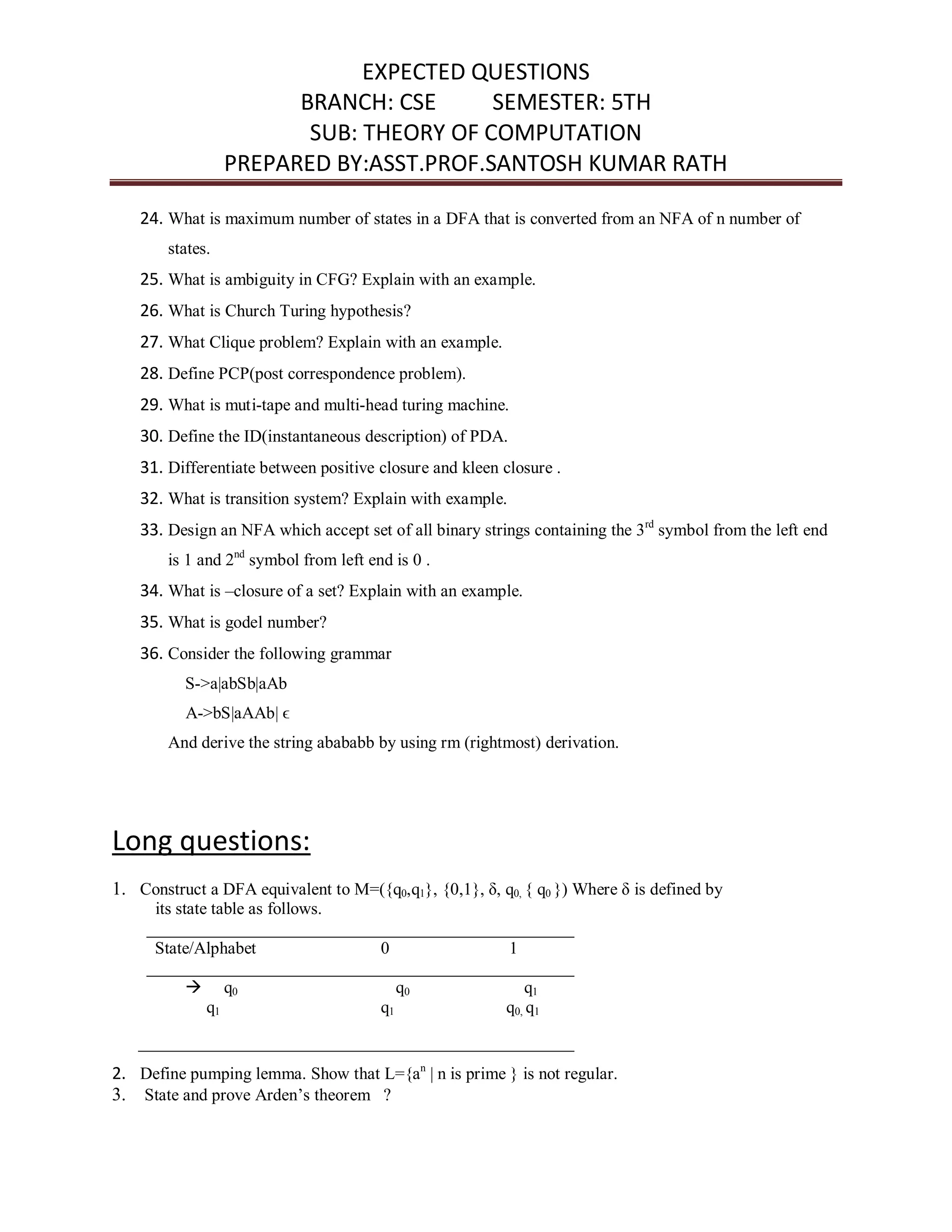 This document lists 30 short questions and 19 long questions related to the subject of Theory of Computation for 5th semester CSE students. The questions cover topics such as the differences between DFAs and NFAs, regular expressions, grammars, languages, automata, Turing machines, complexity classes, and decidability. Example problems include designing automata to recognize specific languages and proving properties of formal languages and grammars.