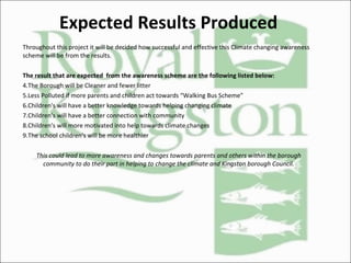 This document outlines the expected results of a climate change awareness scheme. It is hoped that the borough will become cleaner with less litter as more parents and children participate in a walking bus scheme. Children are expected to gain a better understanding of climate change and how to help, as well as strengthen their connection to the community. The children should also become healthier. Overall, the goal is for more awareness and changes among parents and the broader community to do their part in addressing climate change in Kingston borough.