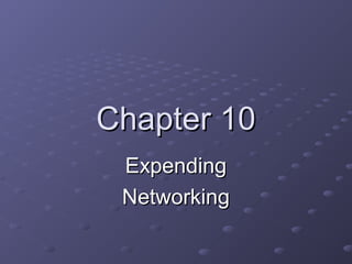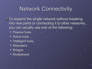 This document discusses various types of networking devices that can be used to expand and connect networks, including hubs, switches, bridges, routers, and multiplexers. Hubs are multiport repeaters that interconnect devices on a network. Switches subdivide networks into smaller logical segments. Bridges and routers can connect different networks, with routers operating at the network layer. Multiplexers allow multiple signals to share a single communication link.