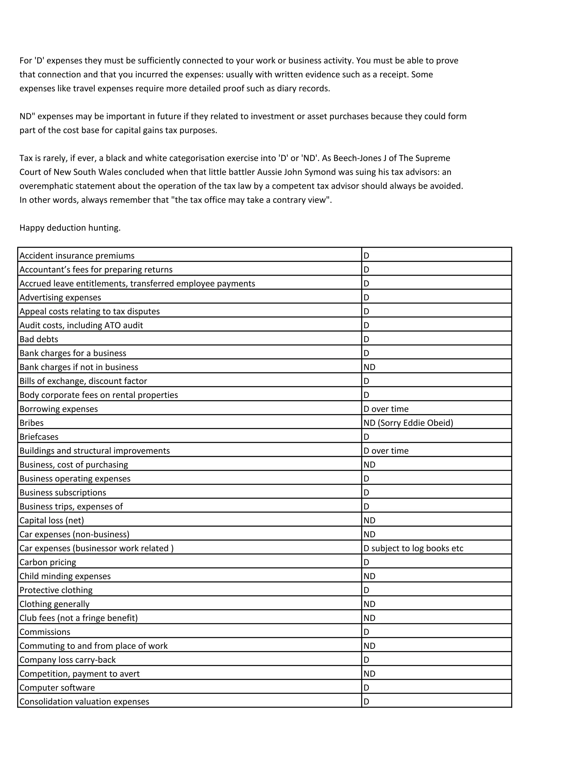 For business expenses to be deductible, taxpayers must prove that the expenses are connected to their work or business and incurred in gaining or producing assessable income. Some expenses like travel require detailed proof such as diary records. Tax treatment of expenses is rarely black and white and the tax office may take a contrary view, so taxpayers should avoid overstating deductions. The document then provides examples of expenses and whether they would generally be deductible (D) or non-deductible (ND).