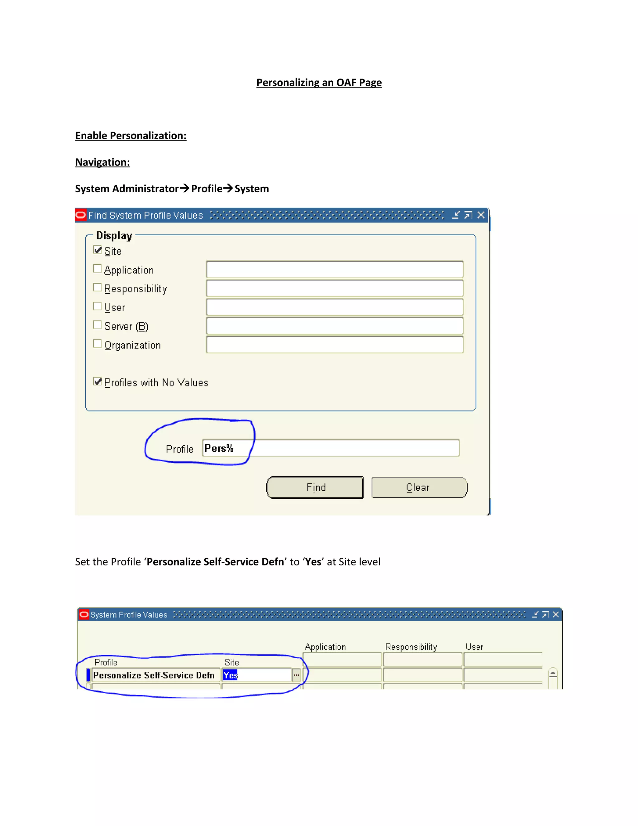 This document provides instructions for personalizing an Oracle Application Framework (OAF) page. It describes how to enable personalization at the site level, identify the view objects and attributes to personalize, and create entity mappings and category mappings through the personalization structure. It also explains how to deactivate or delete personalizations by searching for the personalized page in the Personalization tab of the Functional Administrator responsibility.