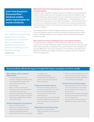 This document summarizes Experian's ConsumerView database, which contains consumer and household data to help brands improve marketing. It contains over 235 million consumer profiles and 113 million household profiles with demographic, behavioral, and purchase history information. Marketers can use this data to more accurately target, segment, and enrich customer profiles, leading to improved campaign response rates, stronger brand loyalty, and increased revenue. The database combines data from various sources to provide a 360-degree view of consumers. It allows marketers to customize campaigns based on the attributes most relevant to consumer behaviors and purchasing decisions in their industry.