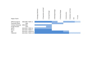 This document outlines the stages of work for several construction projects from 2003-2016. It lists the project definition, preparation and briefing, concept design, developed design, technical design, construction, handover and close out, and in-use stages. It also lists the firms involved in each project stage for APM Krasnogorsk from 2003-2009, Tkachenko Studio in 2005, Tchoban-Shaliavsky from 2005-2006, Pringle Brandon in 2010, WATG from 2010-2013, Benoy from 2013-2014, HKS from 2014-2015, and TPBennett from 2015-2016.