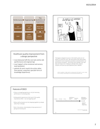 The document introduces experience-based co-design (EBCD), a participatory action research approach that emphasizes collaboration between users and healthcare staff in improving service quality. It highlights the importance of designing experiences rather than just focusing on systems, advocating for active patient involvement to identify needs and propose solutions. The document further outlines methods used in EBCD, including emotional mapping and prototyping, and discusses various implementations and outcomes of EBCD in healthcare settings.