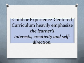 An experience-centered curriculum is based on students' interests and experiences rather than predefined knowledge. The teacher creates a stimulating learning environment for students to explore, make discoveries, and observe others. Students essentially design their own learning by constructing and revising knowledge through hands-on participation and observation. For Dewey, education should start with students' existing experiences and interests, which are personal and constantly changing. The teacher analyzes students' experiences to continually adapt the curriculum to their needs.