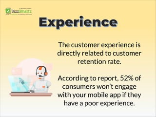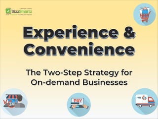 This document discusses the importance of customer experience for businesses in the on-demand economy. It notes that 52% of consumers won't use a mobile app with a poor experience and that 75% of customers expect a quick response within 5 minutes. It also discusses how on-demand services have increased customer expectations around convenience and speed, with 22.4 million customers using on-demand services annually. The key to success for on-demand companies is focusing on factors like mission, vision, consumer research and marketplace data to provide enhanced customer experience and retention.