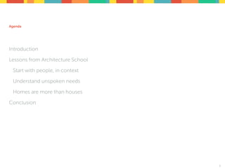 This document summarizes a presentation on lessons from architecture school that can inform experience design for IoT security. Some key lessons discussed include starting design with an understanding of people in their context, considering unspoken needs, and recognizing that homes are more than just houses but reflect cultural contexts. The presentation argues that security for IoT needs a user experience focus and discusses challenges like managing profiles for ambient data capture and reimagining software updates. It concludes that the user experience problems posed by IoT security are important opportunities for design.