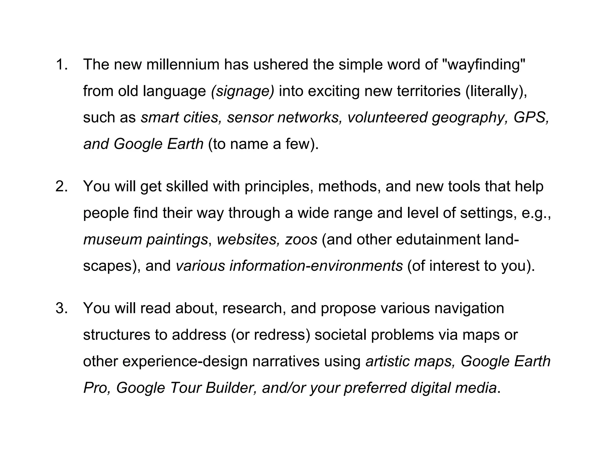The document discusses wayfinding principles, methods, and tools. It outlines a course that will teach students about wayfinding in various settings like museums, websites, and zoos. Students will learn about navigation structures and propose solutions to societal problems using maps and digital media designs. The calendar lists upcoming topics like eye tracking theory, smartphone apps, and wayfinding as a profession.