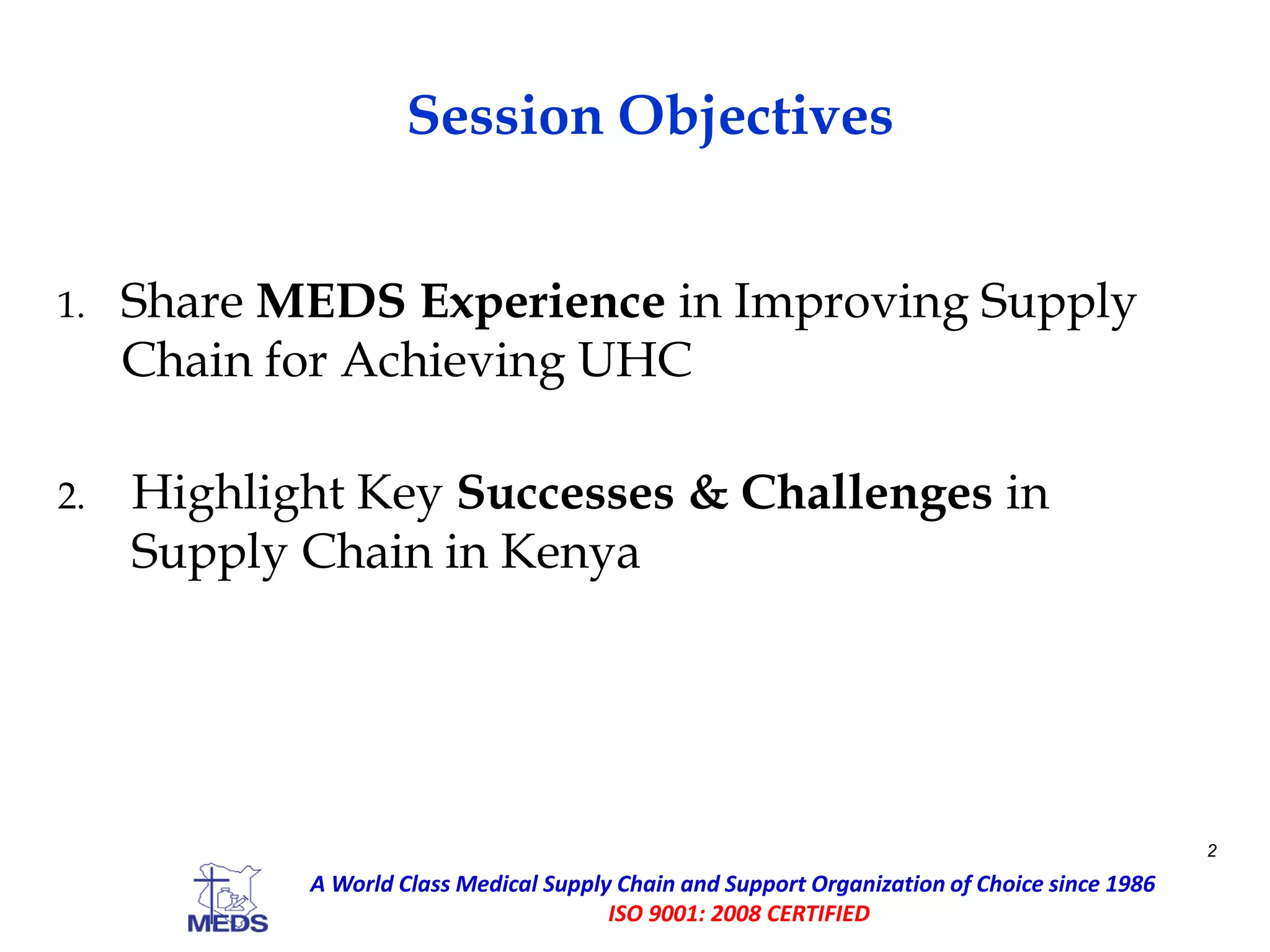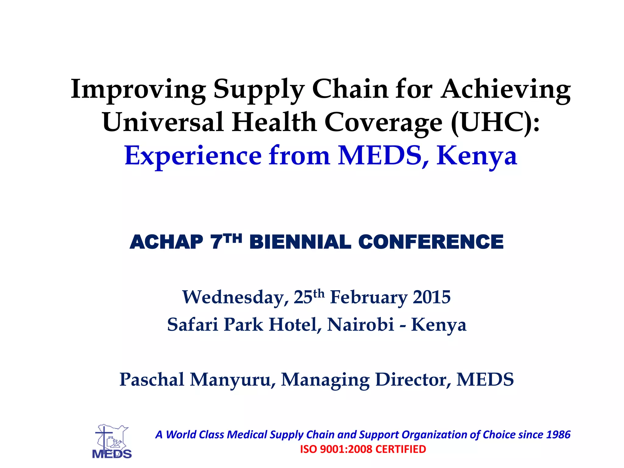 MEDS is a faith-based nonprofit that has improved Kenya's healthcare supply chain since 1986. It serves over 2,000 facilities through reliable distribution of essential medicines and supplies. MEDS also builds capacity through training and supports quality control through its WHO-prequalified laboratory. It has helped increase access to medicines, reduce costs, and promote rational drug use. While Kenya's supply chain faces challenges like weak infrastructure, MEDS has had successes through public-private partnerships and supporting county governments with devolution.