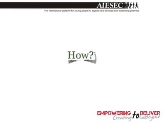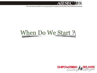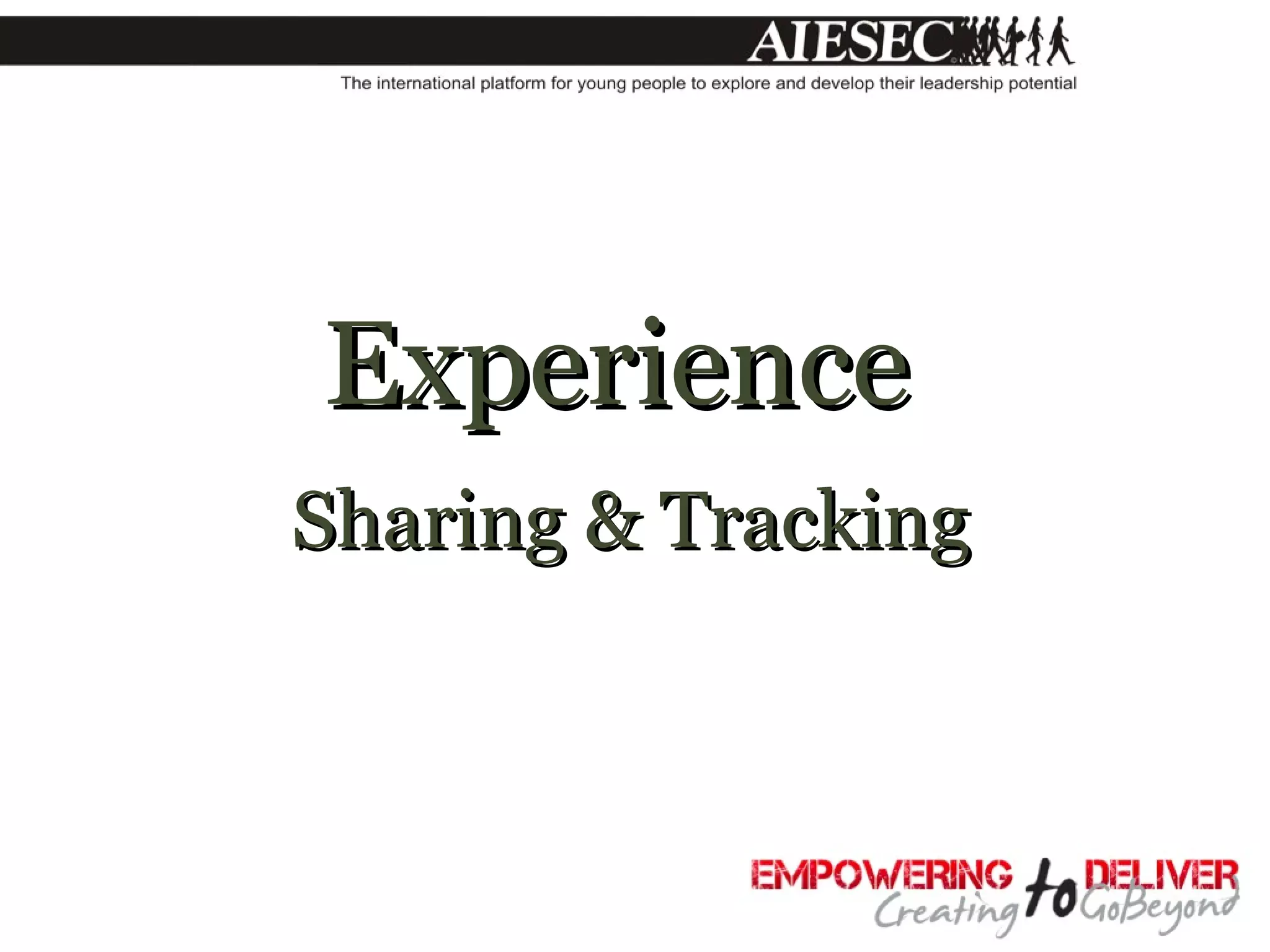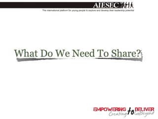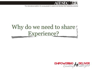This document discusses the importance of sharing experiences and tracking them. It outlines objectives like understanding experiences and showcasing their impact. It also mentions ways to share experiences, what to include, how to judge internship quality, strengthen connections, and be accountable to society. Locations mentioned include iGCDP case studies.