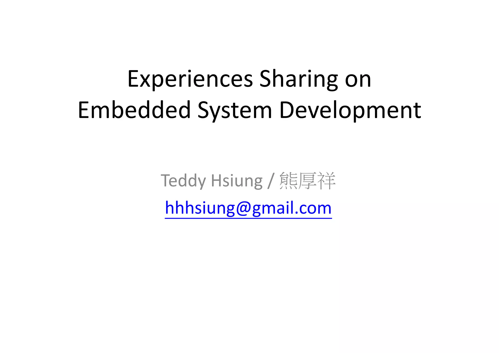 This document discusses embedded system development. It begins with definitions of embedded systems and some of their common characteristics like limited resources and real-time constraints. It then discusses specific issues like memory alignment, flash and RAM sizes, and performance optimizations. Examples are given of embedded projects like digital video recorders and how to address issues like file sorting, memory usage and stack overflows. The conclusion emphasizes that embedded systems involve knowledge from many technical fields and stresses the importance of experience, observation, and a positive problem-solving attitude.