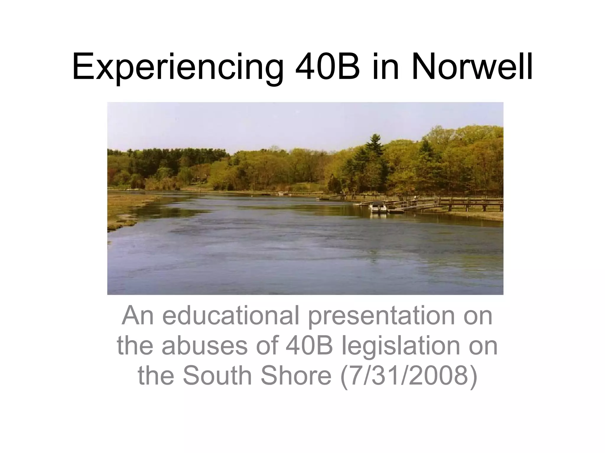 The document discusses the negative impact of 40B legislation on Norwell and the South Shore, highlighting financial and environmental abuses by developers, and the resulting strain on the town's resources. It outlines the scarcity of affordable housing options and the challenges posed by numerous pending and completed 40B projects, which further exacerbate issues like drainage, wildlife habitat disruption, and municipal services. The residents call for a moratorium on 40B projects and urge for better collaboration between the government and towns to address affordable housing needs responsibly.