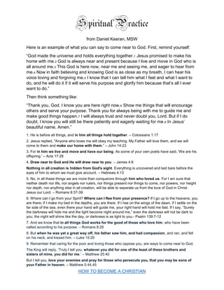 This document provides an example prayer for connecting with God. It begins by reminding oneself of God's omnipresence and love. It thanks God for being present and asks for guidance to encourage others and serve God's purpose. It expresses trust in God even in times of doubt and closes with "Amen" in Jesus' name.