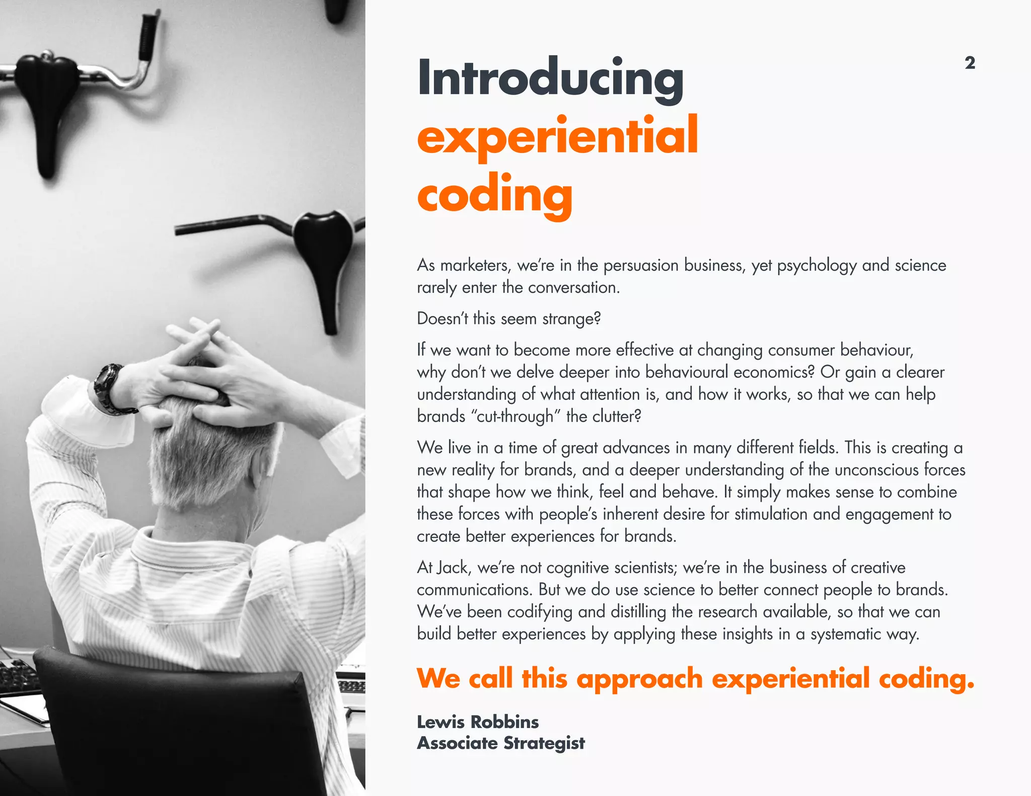 The document introduces experiential coding, a systematic approach that combines science and creativity to design more engaging brand experiences through multi-sensory stimulation. It emphasizes the importance of activating multiple senses to create memorable experiences, evoke emotions, and embody brand values, supported by research in cognitive science. By understanding how sensory design influences perception and behavior, brands can leverage these insights to create impactful marketing strategies in a digitally driven world.