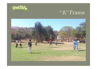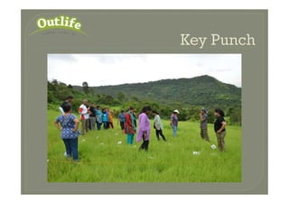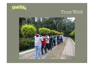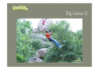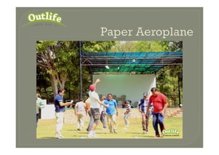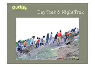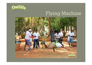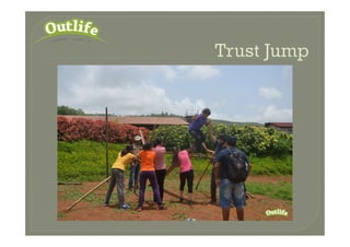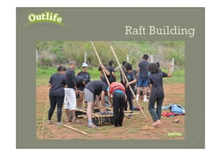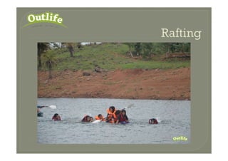 The document outlines various outdoor team-building activities organized by Outlife Adventures, focusing on skills such as teamwork, communication, problem-solving, and creativity. Activities range from orienteering and treasure hunts to white-water rafting and rock climbing, each designed to foster collaboration and personal growth among participants. The activities are structured to include briefings, debriefings, and specific time frames to maximize engagement and learning outcomes during the events.