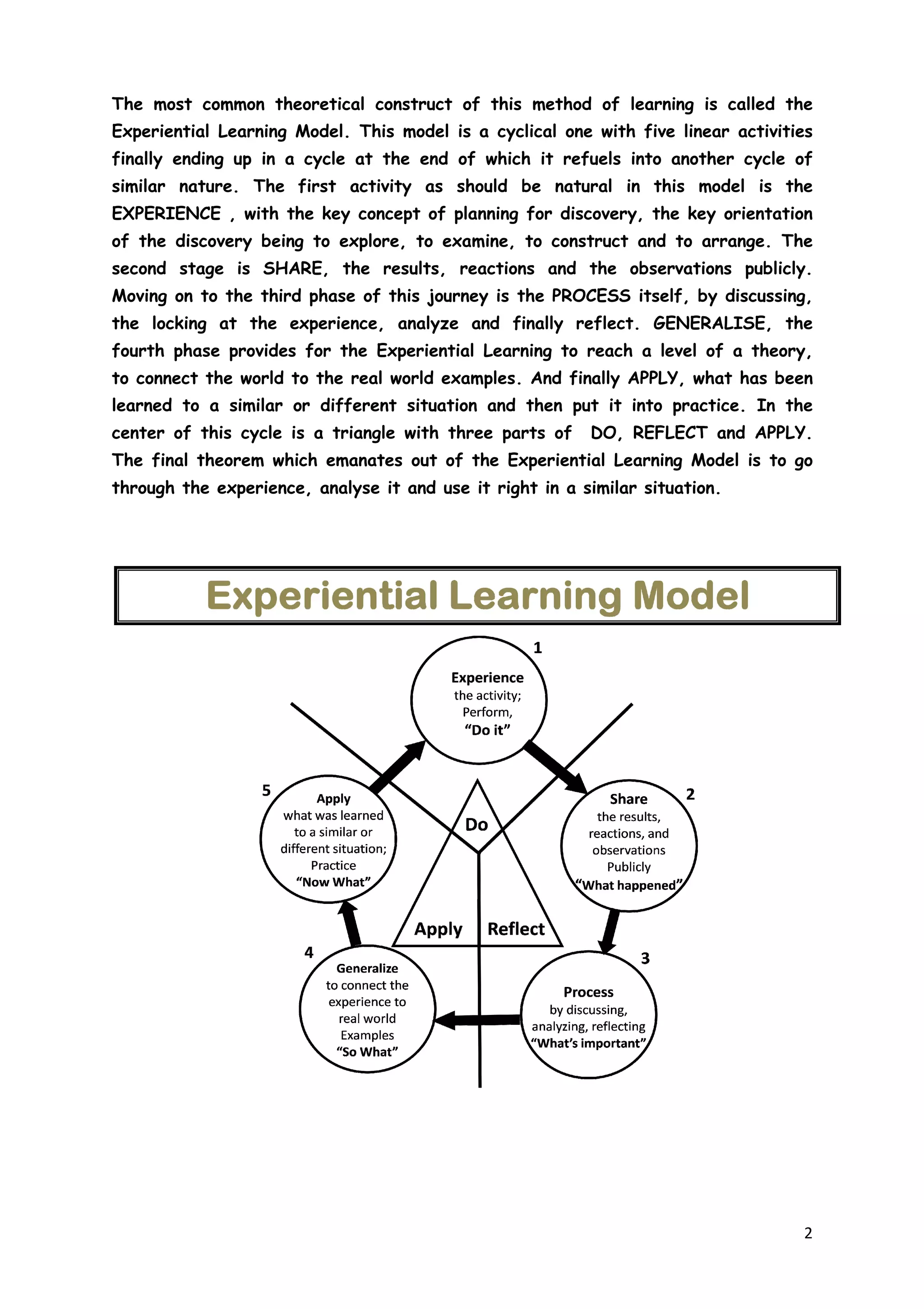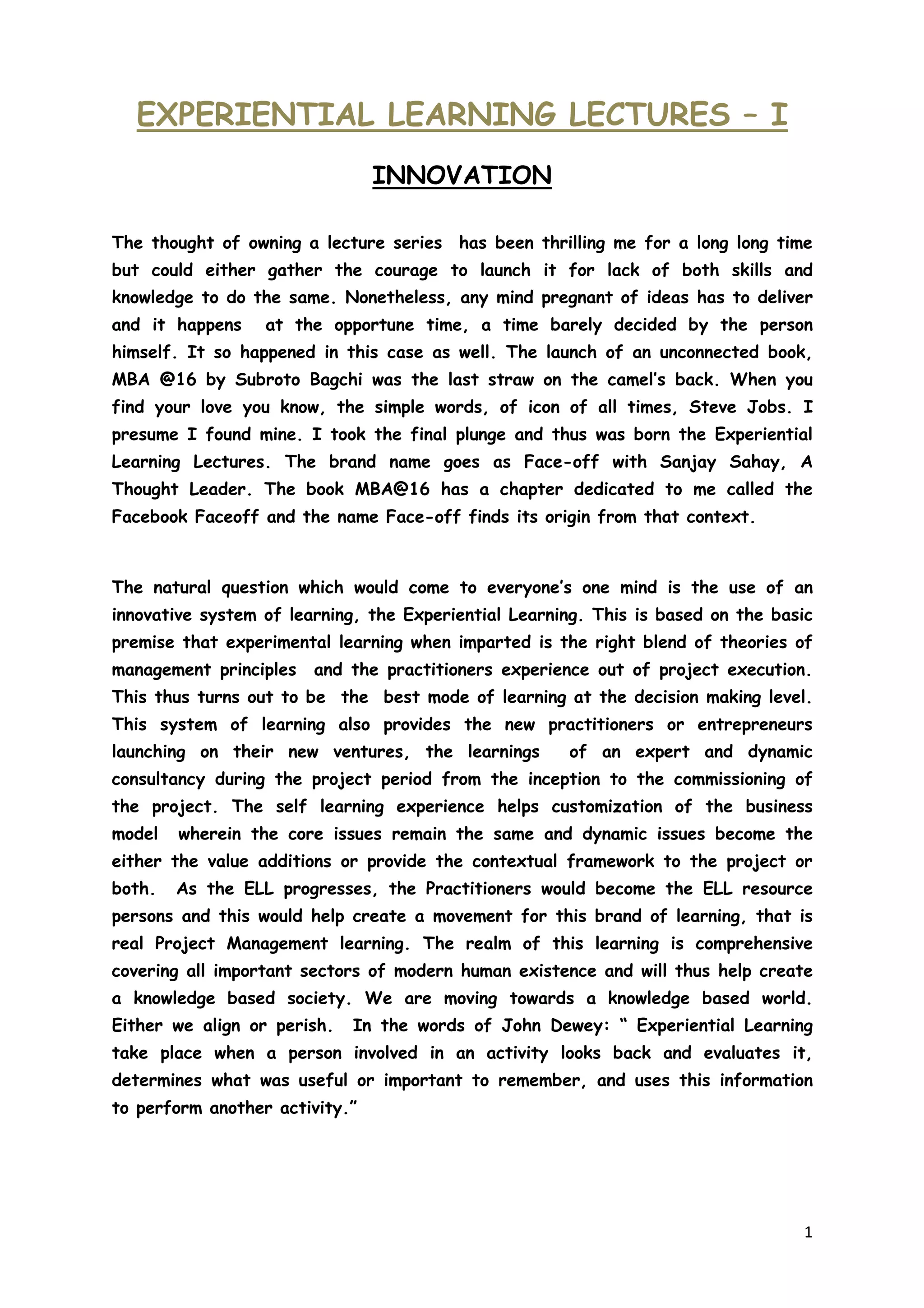 This document discusses experiential learning and innovation. It begins by introducing experiential learning lectures (ELL) and the experiential learning model, which is a cyclical five-stage process of experience, sharing, processing, generalizing, and applying. It then discusses principles of innovation like risk-taking and satisfying customer needs. The document outlines the innovation process as a series of funnels where few ideas become innovations. It discusses factors that influence the effectiveness and diffusion of innovations like implementation pace and the five stages of diffusion. It emphasizes the importance of an "ecology of innovation" like a diversity of ideas, institutions, culture and demographics for new ideas to flourish.