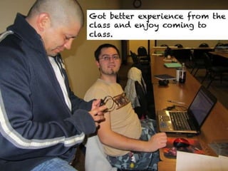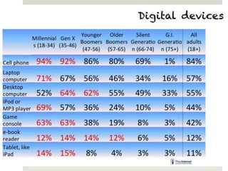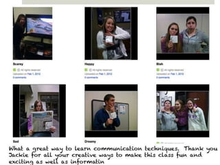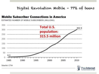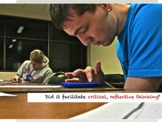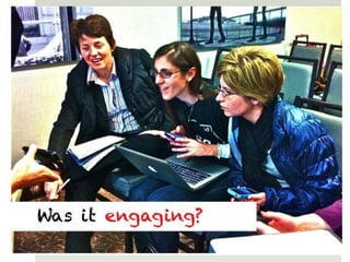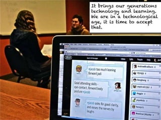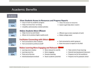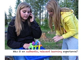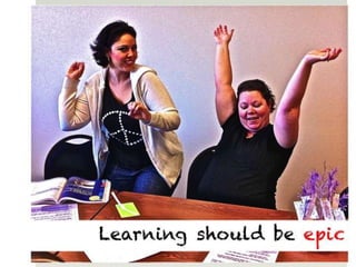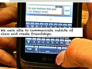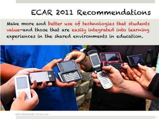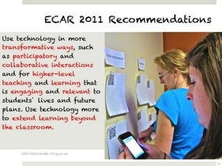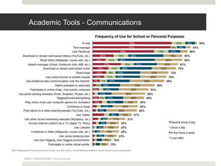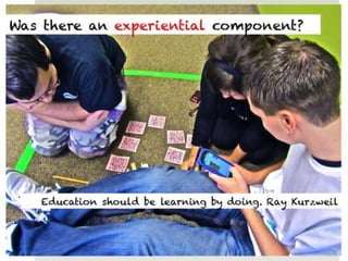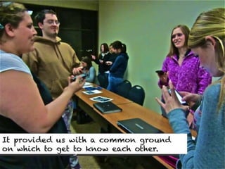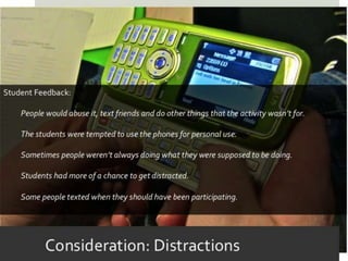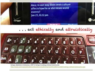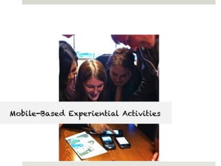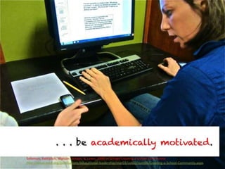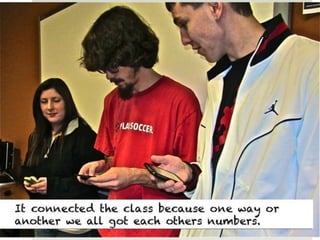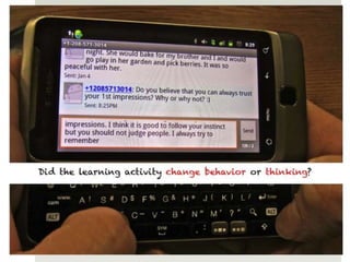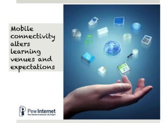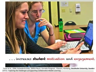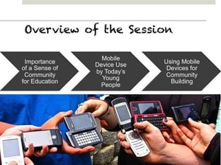 The document outlines various online learning activities and community-building strategies, referencing multiple resources and studies, including the impact of mobile technology on education. It discusses the implications of research on teaching methods and emphasizes the importance of fostering communication and values among learners. Additionally, it highlights the challenges of an 'app gap' and includes links to related materials and tools for creating engaging learning experiences.