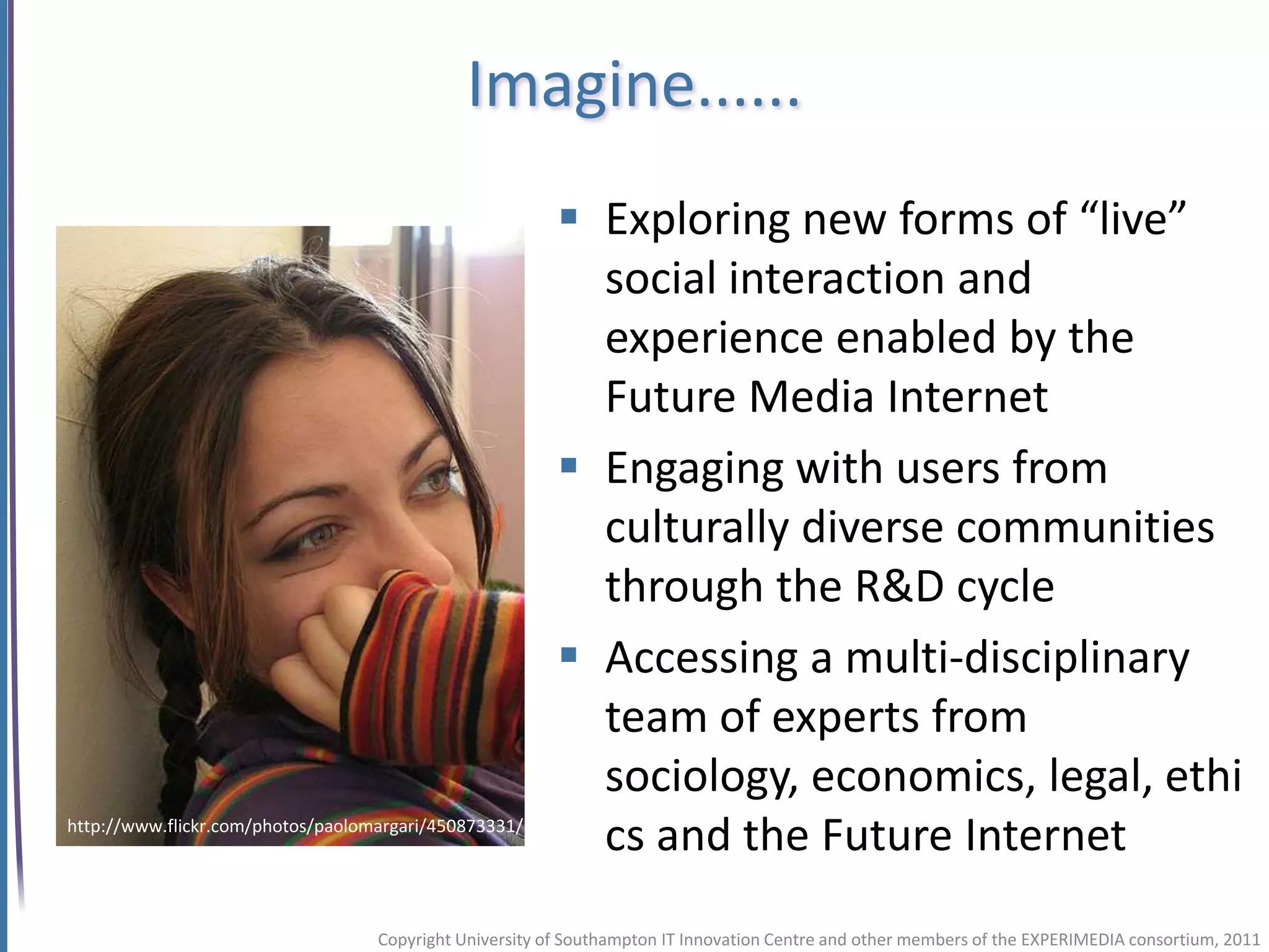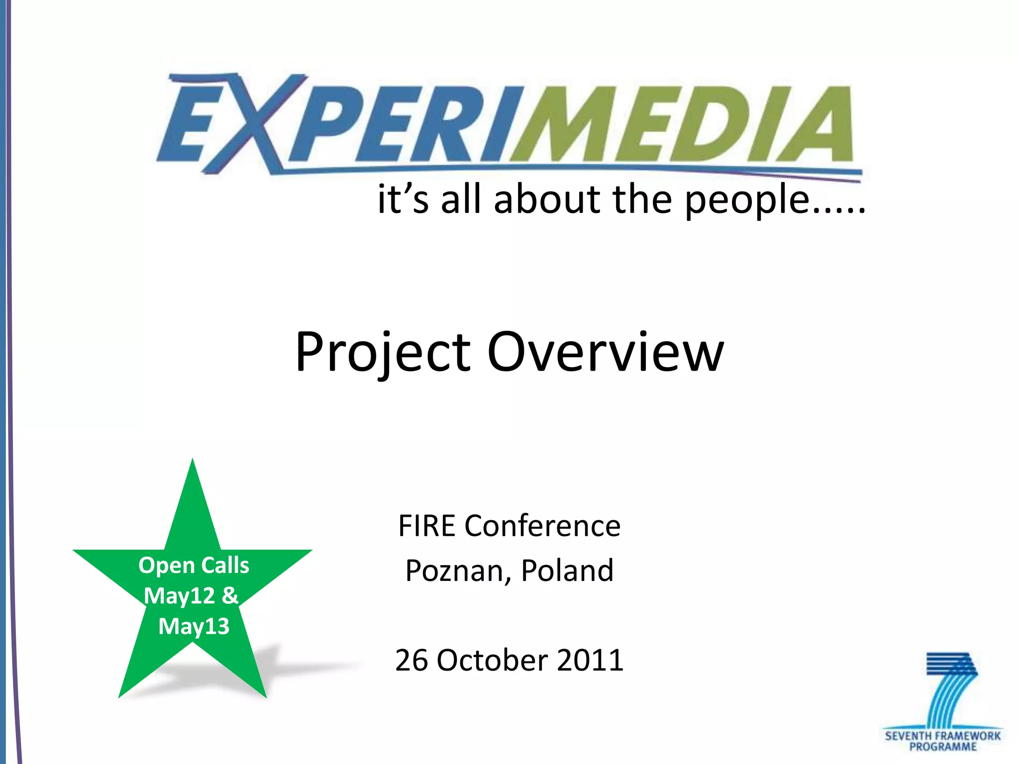 The document summarizes the EXPERIMEDIA project, which aims to accelerate research on innovative Future Media Internet technologies through testbeds. The testbeds will support experiments exploring new forms of social interaction and experience in both online and real-world communities. This will be conducted through real-world and large-scale trials of FI technologies. The project involves 11 partners from 8 countries and has a budget of over 6 million Euros to support experiments through open calls and live events.