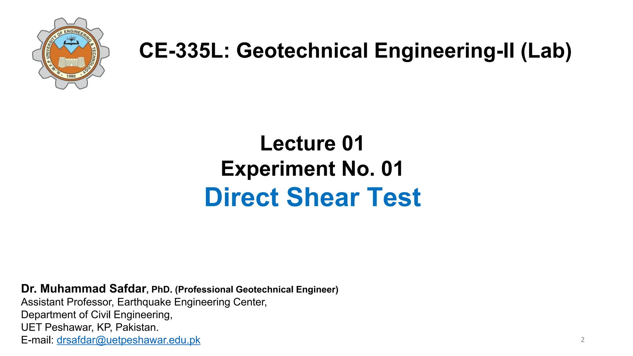 The document outlines the direct shear test used in geotechnical engineering to determine the consolidated-drained shear strength of soils, particularly sandy to silty types. It includes an introduction to shear strength concepts, the importance and significance of the test, equipment required, and a detailed test procedure with data analysis methods. Key formulas for calculating shear stress and interpreting results are also presented.