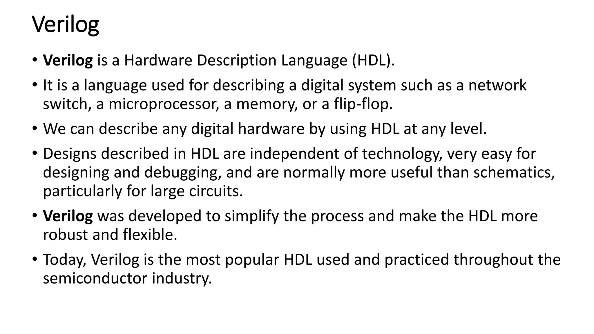 The document explains the use of Verilog, a hardware description language, for designing and verifying digital systems such as logic gates and microprocessors. It covers Verilog syntax, operators, data types, and practical code examples, including the implementation of logic gates and the handling of dumpfiles for debugging. Additionally, it highlights design methodologies like bottom-up and top-down approaches, emphasizing Verilog's flexibility and ease of use in electronic design.