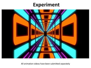 The document describes experiments the author conducted creating digital animations to use for their art project. They tried creating a tunnel animation in After Effects, which they found easy but too simple. They also attempted a kaleidoscope animation tutorial but had difficulties understanding the mirrors tool. Their favorite experiment was an animation that rotated artworks and then exploded outward, which they thought was exciting and captured attention well. They plan to adapt experiments and create new artworks to include in their exhibition opening, aiming for animations that are modern, exciting and showcase their art effectively.
