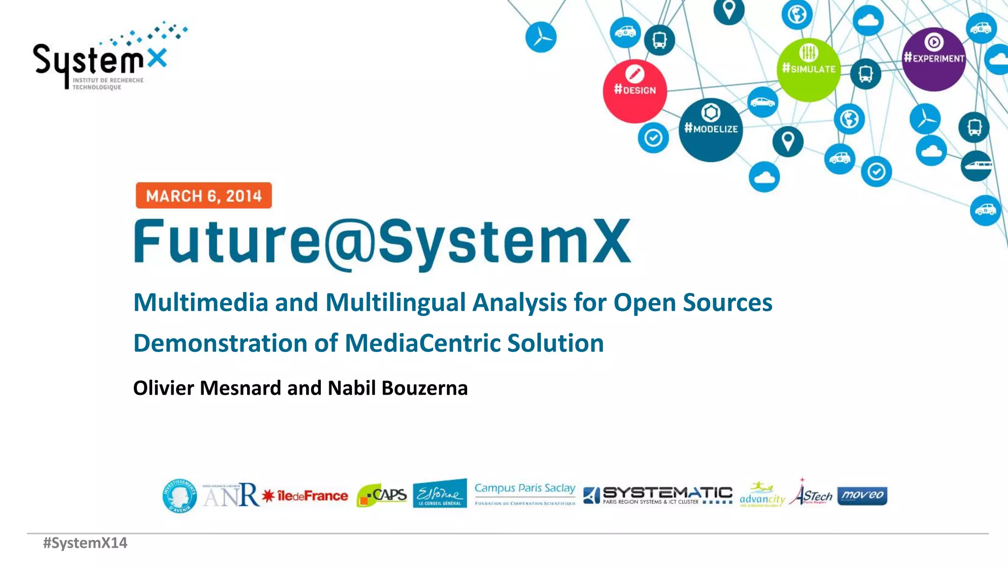 The document outlines the objectives and work to be done for the SystemX14 project. The project aims to develop an experimental platform for analyzing unstructured content like text, audio, and video from open sources using natural language processing and text mining software. Key objectives are to integrate these components, develop applications for information retrieval and open source monitoring, and account for user needs not met by existing applications. Work includes improving processing on noisy data, integrating new languages, interconnecting components, and addressing scalability, immediacy, and innovative user interfaces.