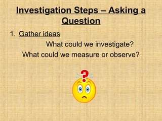 The document outlines the steps for carrying out a scientific investigation: 1) Gather ideas and questions, 2) Form a question to investigate, 3) Plan what variable will be changed and what will be measured, 4) Make a prediction about what will happen when the variable is changed, 5) Plan the experiment including materials needed and procedures, 6) Conduct the experiment and record observations, 7) Record results in a table and graph the data, 8) Analyze the results and draw a conclusion.