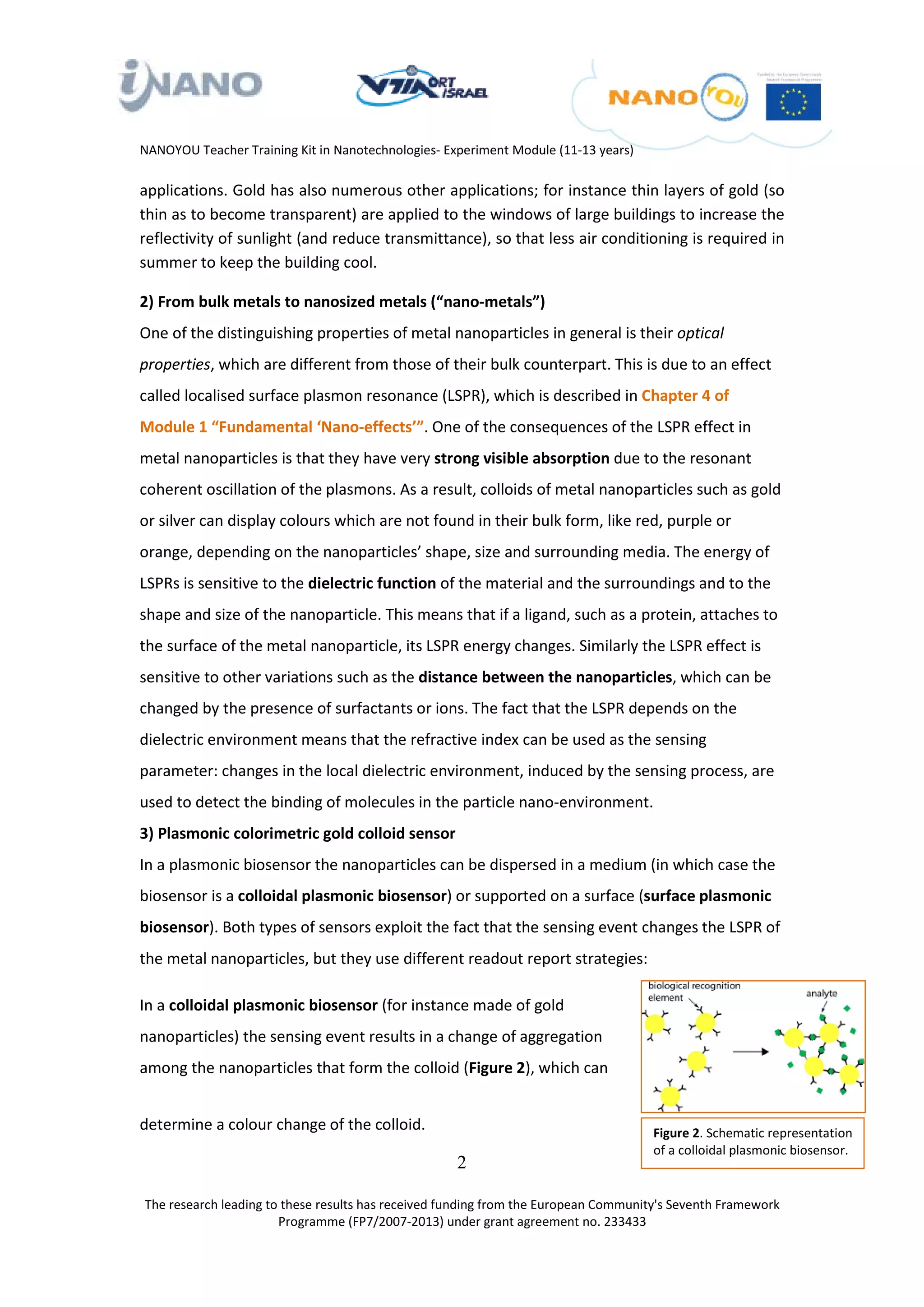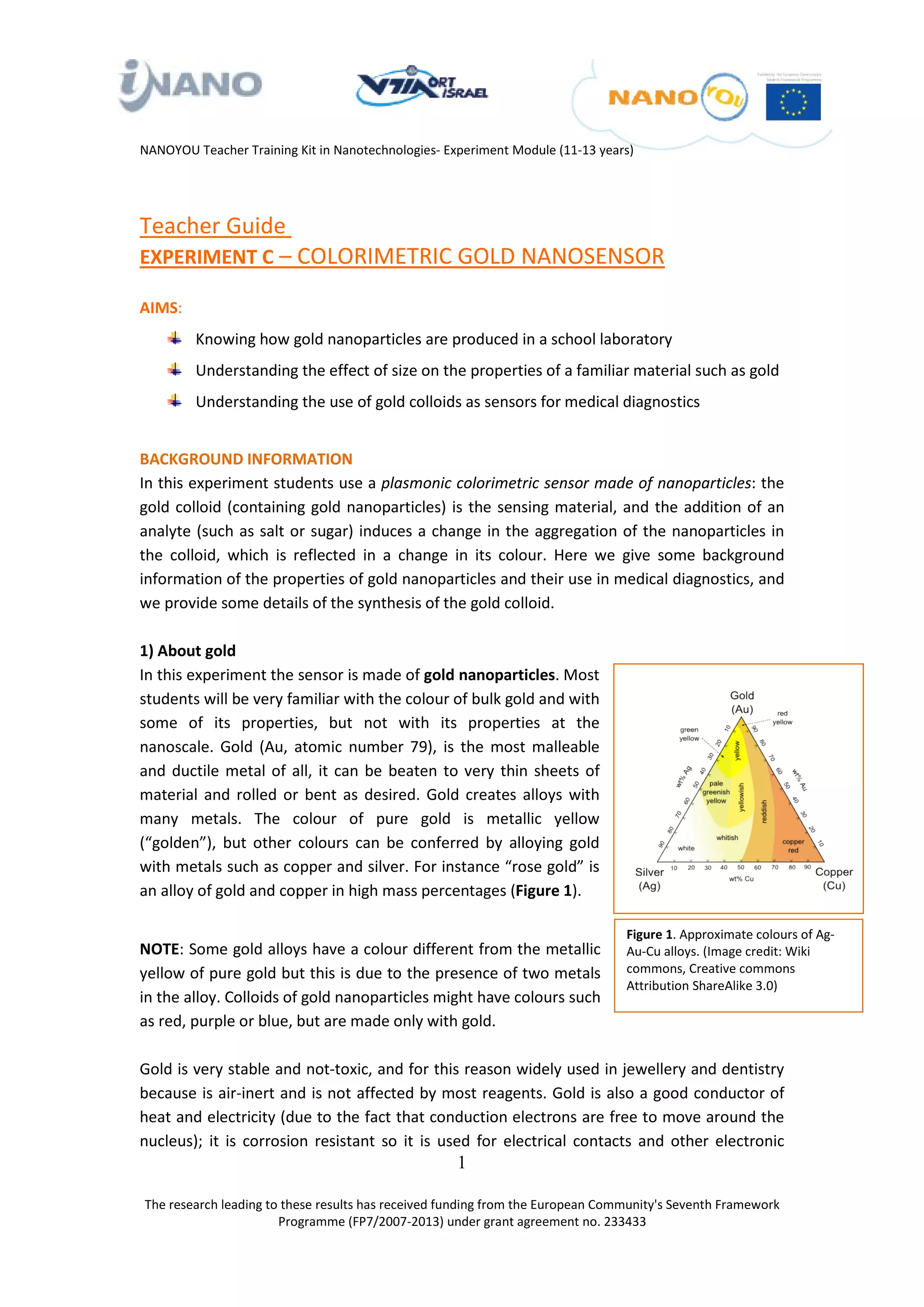The document outlines a teacher training kit for a nanotechnology experiment aimed at students aged 11-13, focusing on colorimetric gold nanosensors. It explains the production and properties of gold nanoparticles, their applications in medical diagnostics, and provides safety guidelines for conducting classroom experiments. The experiments will facilitate understanding of how changes in the nanoparticle environment can result in observable color changes, reflecting their utility in sensing applications.