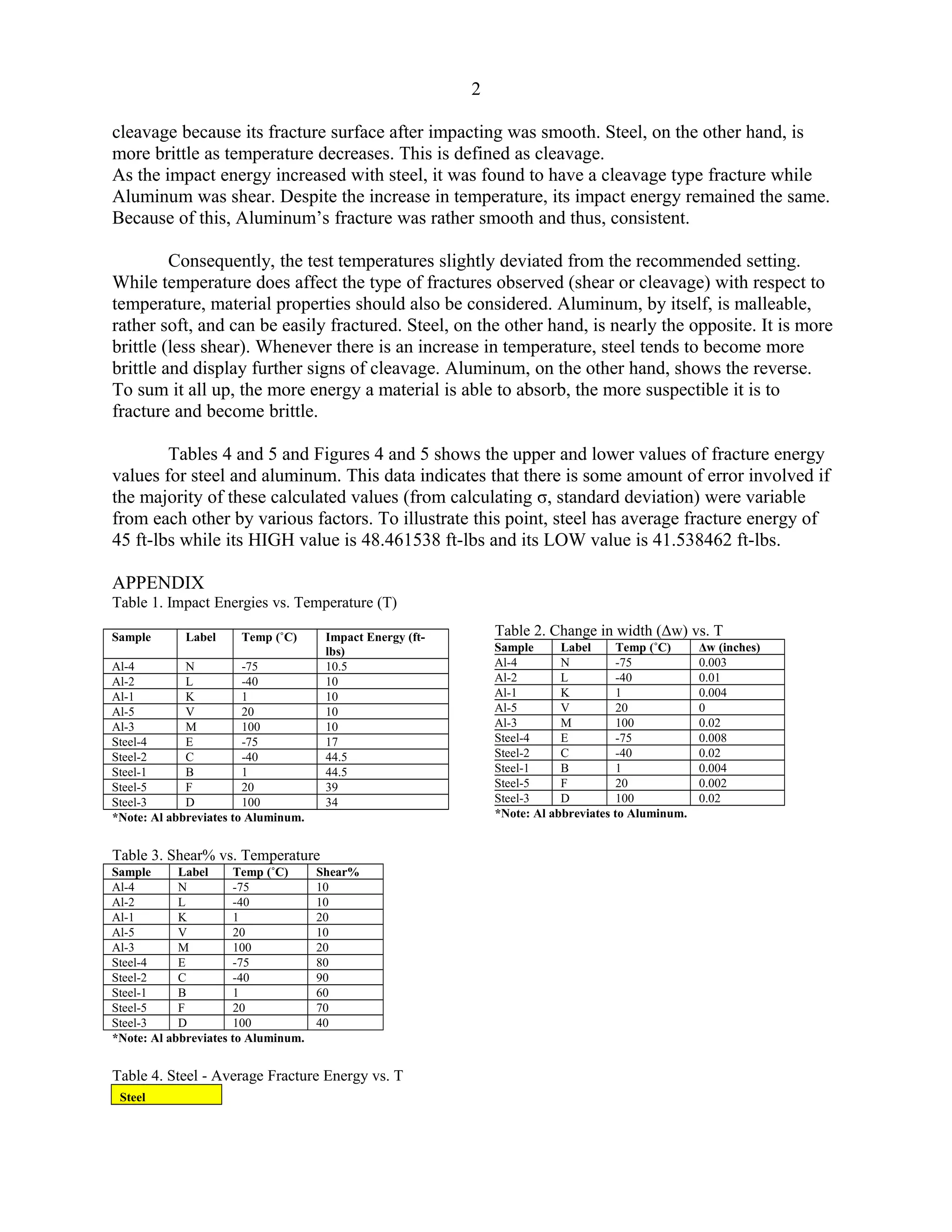 The document summarizes an experiment investigating the ductile-to-brittle transition in steel and aluminum samples under varying temperatures. Steel samples exhibited increasing impact energy and more brittle fractures as temperature increased, while aluminum impact energy and ductile fractures remained constant regardless of temperature. Data tables and figures show the relationships between impact energy, lateral expansion, shear percentage, and temperature for each material. There was some variability in the fracture energy calculations between the samples.