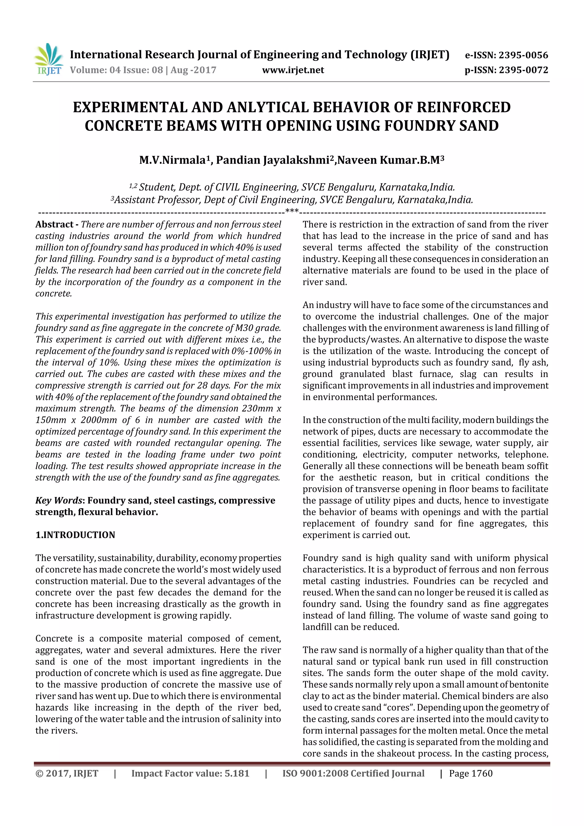 This document discusses an experimental study on the use of foundry sand as a partial replacement for fine aggregate in reinforced concrete beams. Foundry sand is a waste byproduct from metal casting industries. The study aims to utilize this waste material in concrete production. Concrete cubes and beams were cast using foundry sand replacements of 0-100% in increments of 10%. Beams were cast with a rounded rectangular opening. Testing found that a 40% replacement of foundry sand provided the maximum compressive strength. Beams were then cast using the 40% optimized mix and tested under two-point loading. Test results showed that foundry sand can be used as a partial replacement for fine aggregate in concrete, improving strength and providing an outlet for an