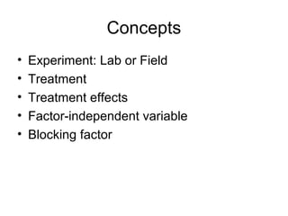 Experimental research designs involve examining potential cause-and-effect relationships between variables through experiments. There are various types of experimental designs including informal designs like quasi-experiments and pre-test/post-test designs, as well as formal designs like completely randomized designs, randomized block designs, Latin square designs, and factorial designs. These designs allow researchers to systematically test and compare the effects of independent variables or treatments on a dependent variable while controlling for other possible influences.