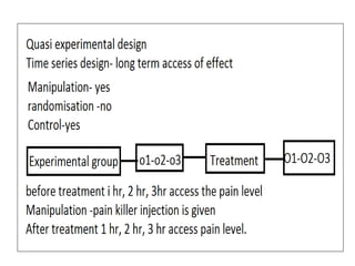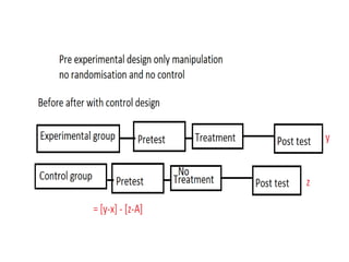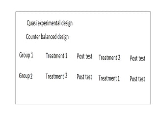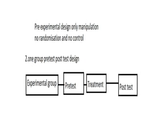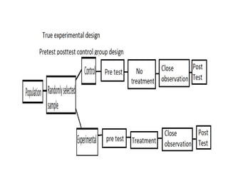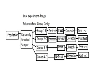 Experimental design techniques involve controlling variables to measure their effects. There are three main types of designs: pre-experimental (no control group), quasi-experimental (no random assignment), and true experimental (control group, random assignment, manipulation). True experiments allow cause-and-effect conclusions through statistical analysis and include variations like post-test only, pre-test post-test, and Solomon four-group designs. Factorial designs test multiple hypotheses simultaneously by manipulating multiple independent variables. Randomized block and cross-over designs help control for differences between subjects. The goal is to draw valid conclusions about variable relationships through controlled experimentation.