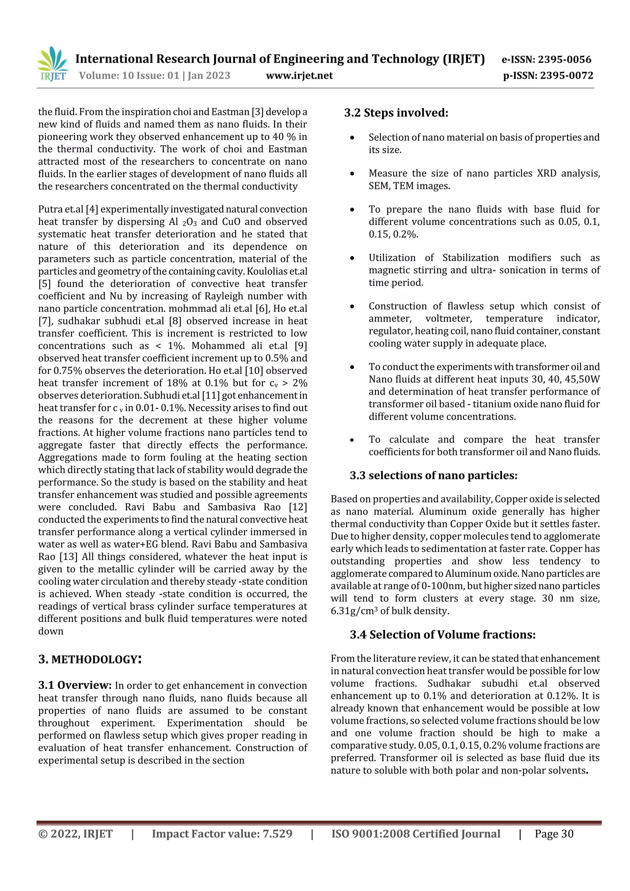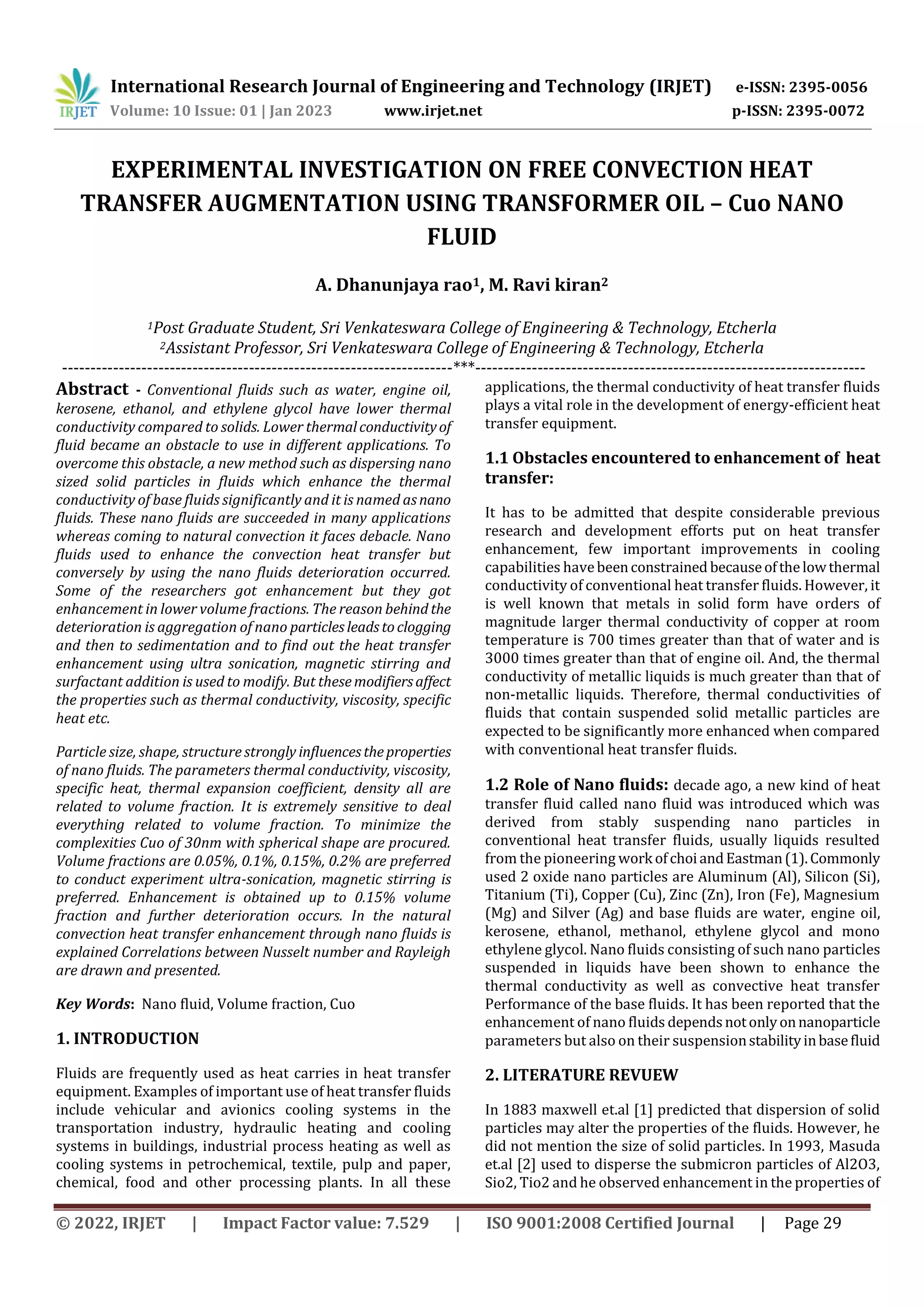 This document experimentally investigates heat transfer augmentation using transformer oil mixed with copper oxide (Cuo) nanofluid. The study constructed an experimental setup to test different volume fractions of Cuo nanofluid (0.05%, 0.1%, 0.15%, 0.2%) under various heat inputs. Results found heat transfer coefficient increased up to 0.15% volume fraction compared to transformer oil alone, but decreased at higher concentrations due to nanoparticle aggregation. The maximum enhancement of 17.8% in heat transfer coefficient occurred at 0.15% volume fraction and 50W heat input. Magnetic stirring for 1 hour and ultrasonication for 30 minutes were used to achieve stable nanofluid suspensions. In conclusion, natural convective heat transfer