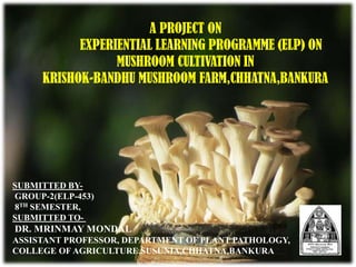 The document outlines a project on experiential learning in mushroom cultivation at Krishok-Bandhu Mushroom Farm, detailing the objectives, methodologies, and educational outcomes for the participating students. It highlights the significant economic and nutritional benefits of cultivating oyster mushrooms, as well as production techniques and associated challenges. The project's cost analysis indicates a viable profit margin, emphasizing the potential for empowering rural communities through agricultural entrepreneurship.