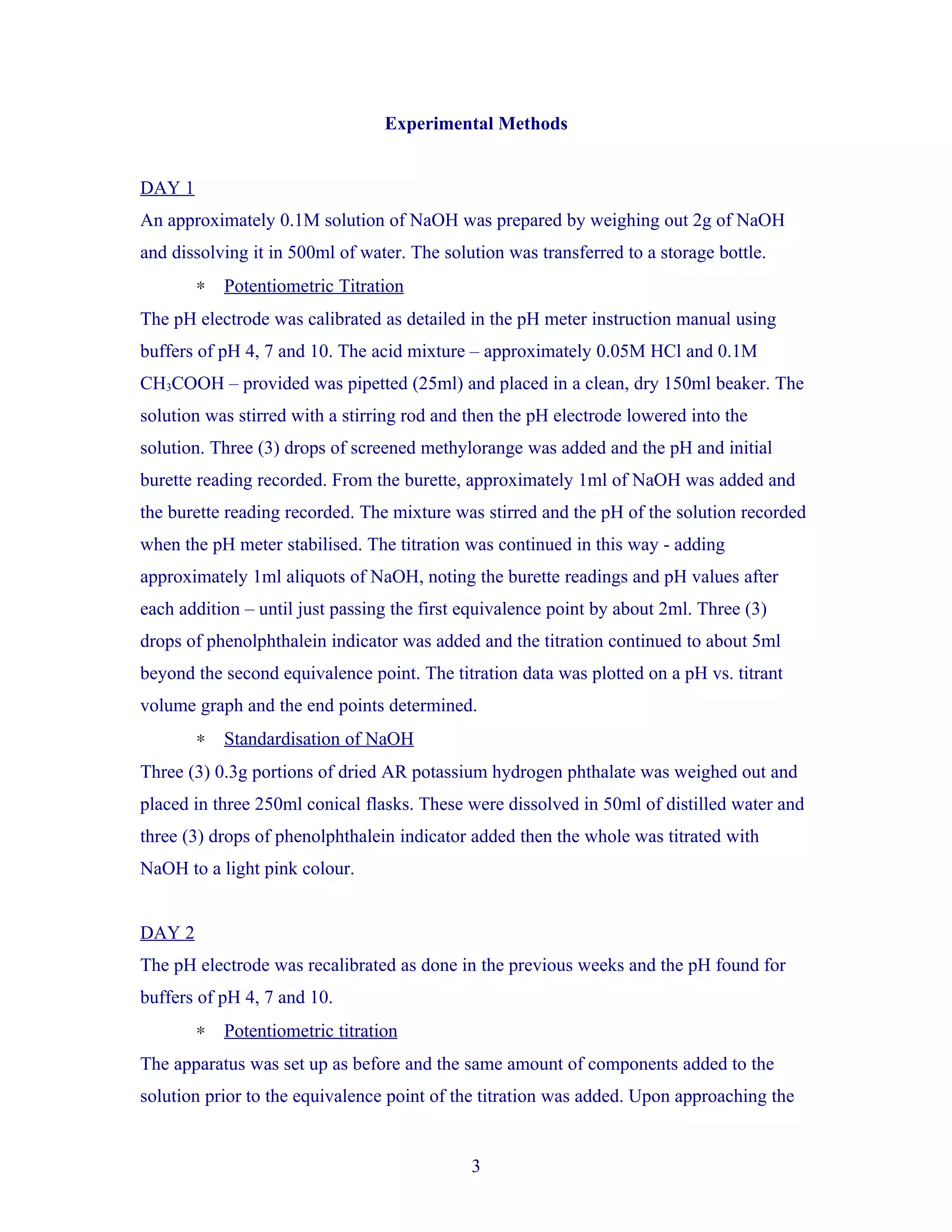 The document describes experimental methods conducted over two days. On day 1, a 0.1M NaOH solution was prepared and used to titrate an acid mixture potentiometrically, recording pH and burette readings at each addition. The NaOH was also standardized by titrating potassium hydrogen phthalate and recording the volume needed to reach the endpoint. On day 2, the pH electrode was recalibrated and the potentiometric titration was repeated with dropwise NaOH additions near the equivalence points. The NaOH was standardized again.