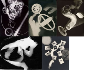 Hannah Hoch, John Heartfield, Alvin Langdon Coburn, Man Ray, and David Hockney were experimental photographers who used traditional techniques to create abstract and conceptual works. Hoch created photomontages exploring concepts of beauty, race, and gender. Heartfield used anti-Nazi propaganda. Coburn developed abstract photographs using mirror systems. Man Ray created photograms or "Rayographs" by placing objects on light-sensitive paper. Hockney structured Polaroid photos to form abstract compositions. Their work would be found in galleries and textbooks rather than for commercial uses like advertising.