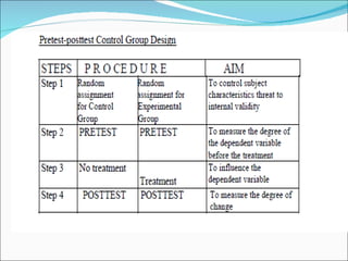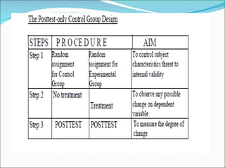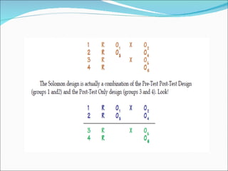 This document discusses different types of experimental research designs, including their advantages and disadvantages. It covers true experimental designs like pretest-posttest and Solomon four-group designs. It also discusses quasi-experimental designs like nonequivalent control group and time series designs, as well as pre-experimental designs. Threats to internal and external validity are explained for different designs.