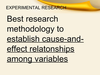 Experimental research uses manipulation of independent variables and random assignment to test hypotheses about cause-and-effect relationships between variables. Key characteristics include comparing experimental and control groups, where the experimental group receives the treatment and the control group does not. True experimental designs with random assignment are strongest, while quasi-experimental designs lack random assignment. Various designs are used including pretest-posttest and posttest-only with control groups. Factorial designs study interactions between treatments and moderator variables.