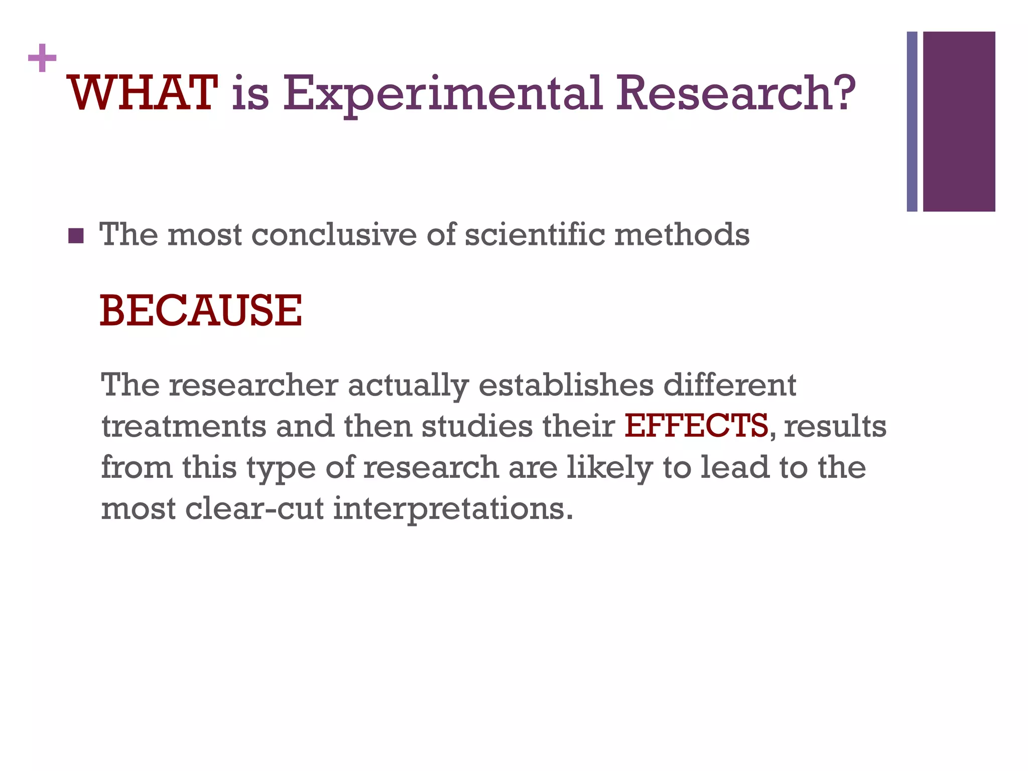 Experimental research is the most conclusive scientific method because the researcher directly manipulates the independent variable and studies its effects on the dependent variable. This allows the researcher to determine causal relationships. The purpose is to establish cause-and-effect between variables. Basic steps involve having an experimental group that receives a treatment and a control group that does not, then comparing outcomes. Key characteristics include random assignment to control threats to internal validity. Poor designs have no control groups or pre/post tests for comparison, while strong designs use random assignment to treatment/control groups.