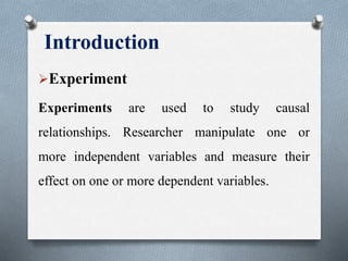 This document discusses experimental research design. It defines experimental research as studying causal relationships by manipulating independent variables and measuring their effect on dependent variables. The key types of experimental design discussed are pre-experimental, quasi-experimental, and true experimental. True experimental design involves random assignment, a control group, and manipulation of an independent variable to test a hypothesis. Methods of data collection in experimental research include observation, simulation, and surveys.