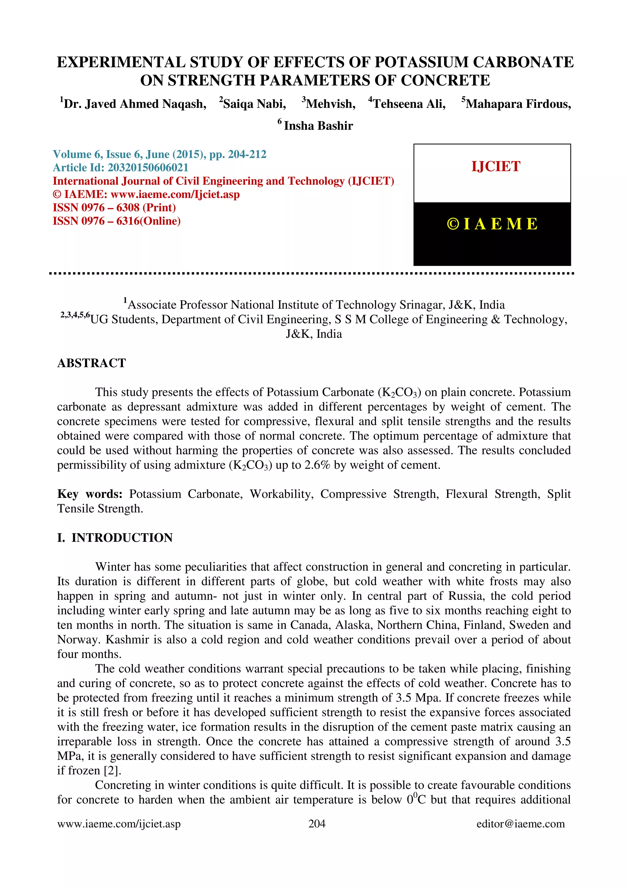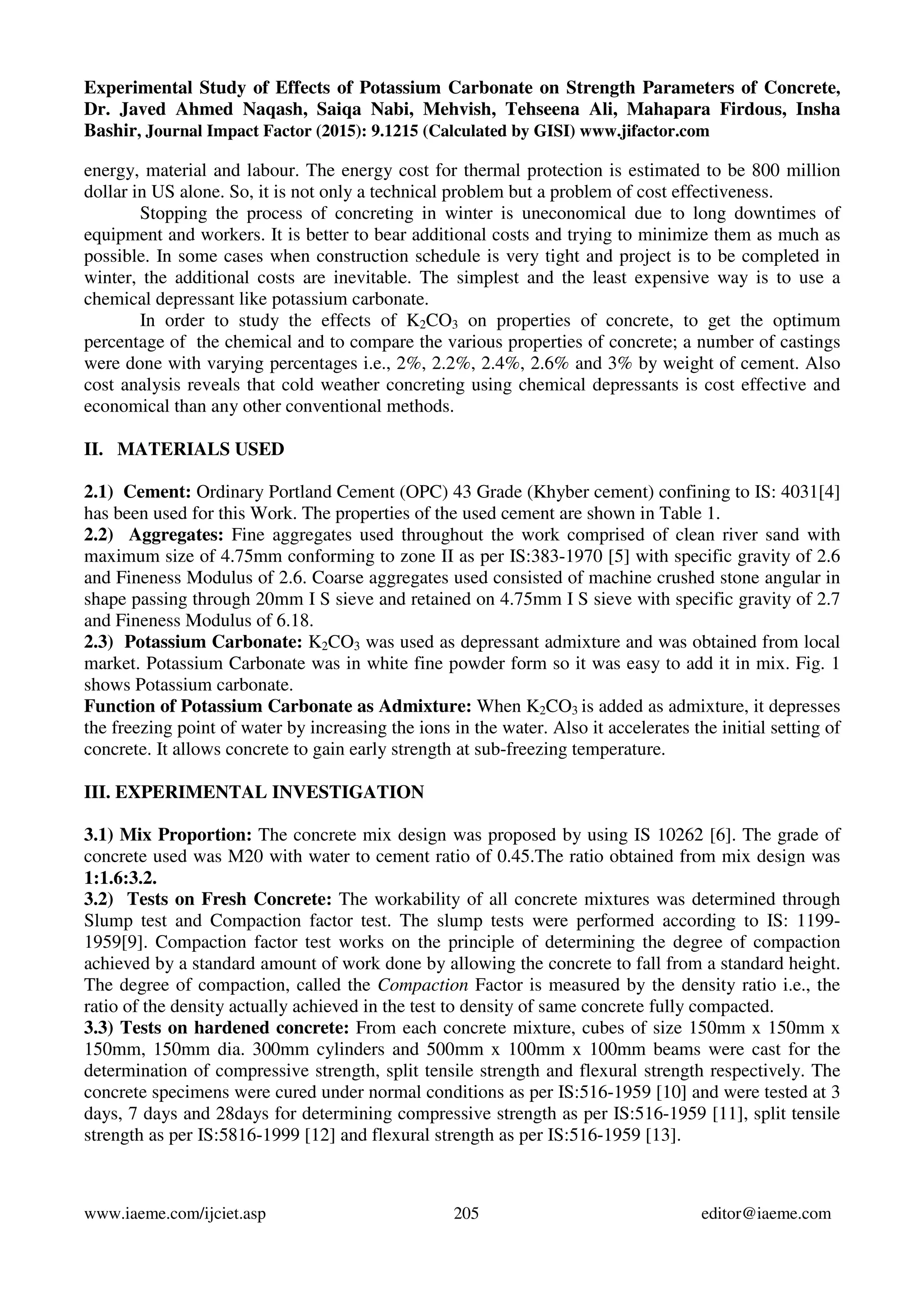 This study examines the effects of potassium carbonate (K2CO3) on the strength properties of plain concrete. Concrete specimens were produced with K2CO3 added at different percentages by weight of cement (2%, 2.2%, 2.4%, 2.6%, and 3%). The specimens were tested for compressive, flexural, and split tensile strengths at various ages. Results showed strengths increased up to 2.6% K2CO3 addition, but decreased with 3% addition. The optimum K2CO3 percentage was found to be 2.6%, as it improved strengths without harming concrete properties.