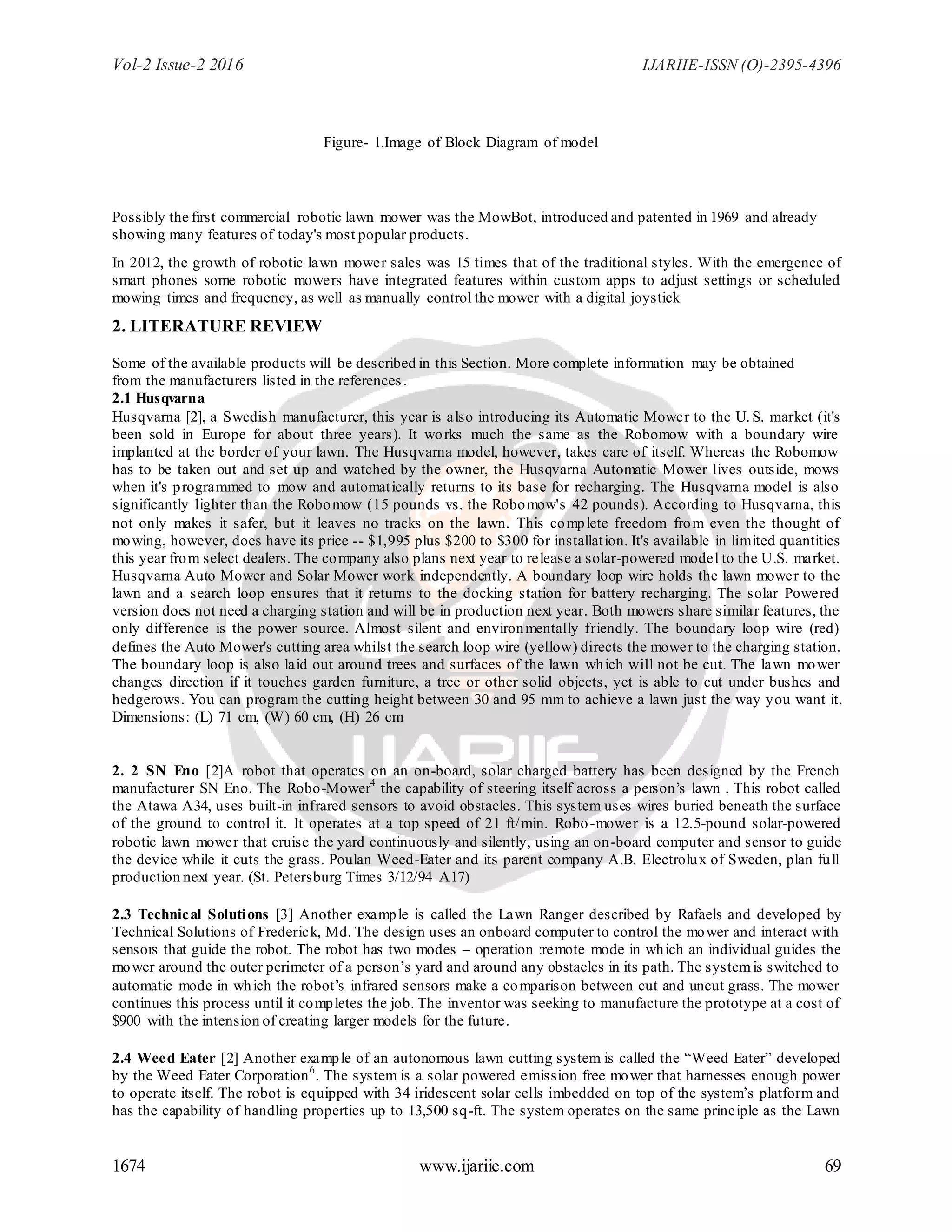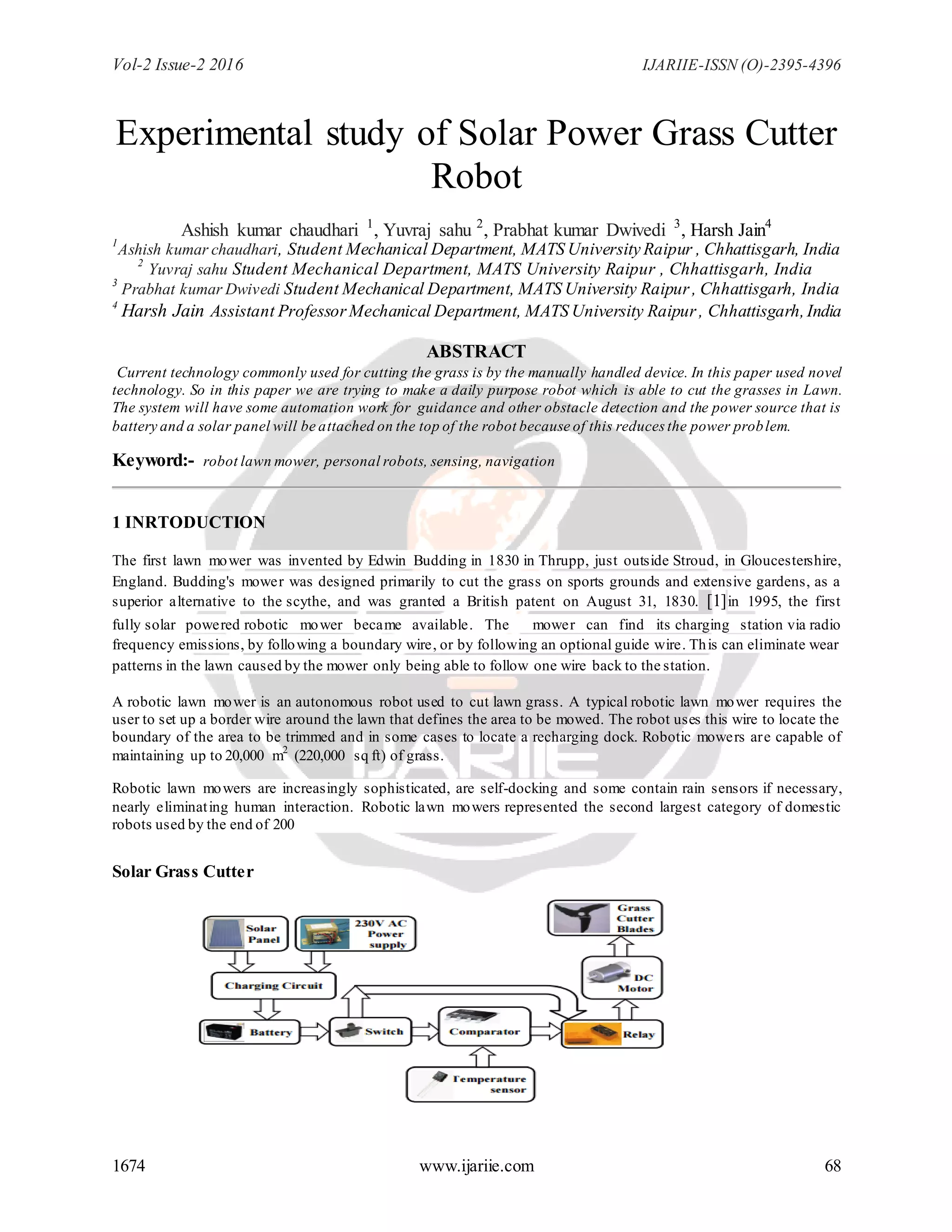 This document presents an experimental study on a solar-powered grass cutter robot designed to automate lawn mowing, utilizing solar energy to address power challenges. The study details the historical background of lawn mowers, reviews existing robotic mower technologies, and identifies the advantages of solar-powered systems. Key components of the proposed prototype, including solar panels, batteries, and operating mechanisms, are also discussed alongside the overall methodology of deploying this robotic solution.