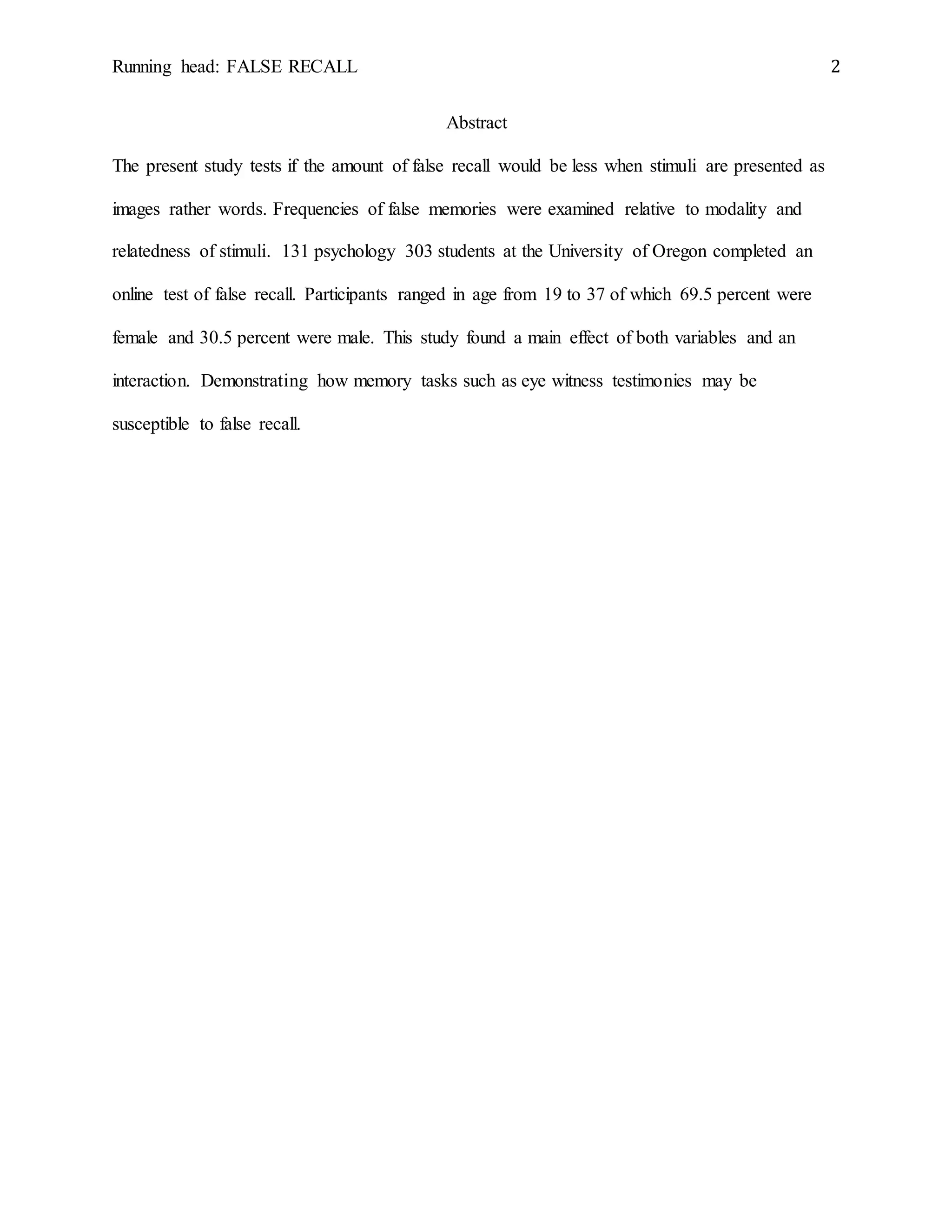 This study examined the effect of modality (words vs images) and relatedness of stimuli (related vs unrelated items) on false recall. 131 university students completed an online test with 2 study lists, one containing related words/images and the other containing unrelated words/images. The study found a main effect of both modality and relatedness, with higher false recall for related items and words compared to images. This suggests memory tasks like eyewitness testimony may be susceptible to errors from false recall.