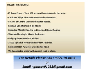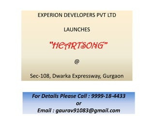 Experion Developers Pvt Ltd is launching a new housing project called "Heartsong" located in Sec-108, Dwarka Expressway, Gurgaon on a 15-acre plot. The project will consist of 2/3/4 BHK apartments and penthouses with amenities such as a central green area, clubhouse, modular kitchens and marble flooring. Investors can benefit from no pre-launch costs for the first 100 bookings and first transfer free, along with competitive rates starting from INR 5500 per square foot.