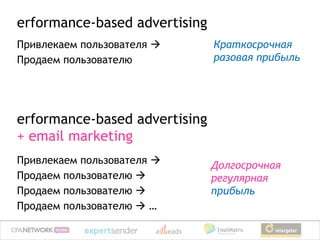 Документ обсуждает стратегии и преимущества емейл-маркетинга, акцентируя внимание на его интеграции с performance-based advertising. Он описывает различные подходы, такие как обработка незавершенных заказов и кросс-продажи, а также подчеркивает важность использования готовых решений и выбор надежных партнеров. Эффективность емейл-маркетинга измеряется в повышении прибыли и снижении затрат на коммуникацию.