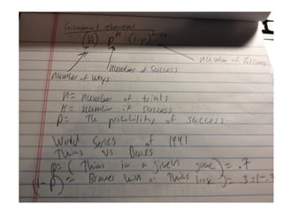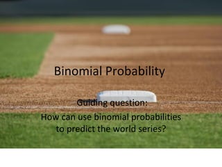 This document discusses using binomial probabilities to predict the outcome of a best-of-seven World Series between the Minnesota Twins and the Atlanta Braves. It poses the question of what the probability is that the Twins beat the Braves in the series. The author spent 10 hours working on this probability problem and created an 18-minute video to show highlights and solutions through pictures and screen captures rather than requiring viewers to watch the full video.