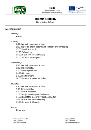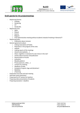 The document outlines the schedule and agenda for a project meeting taking place in Belgium from Monday to Thursday, with arrival and departure days on Friday and Monday. The schedule includes pickups from the hotel, project meetings, school tours, meals, and social activities each day. The draft agenda discusses replanning project themes, visits, and tasks, as well as general agreements around reservations, programs, costs, reports, and deadlines.
