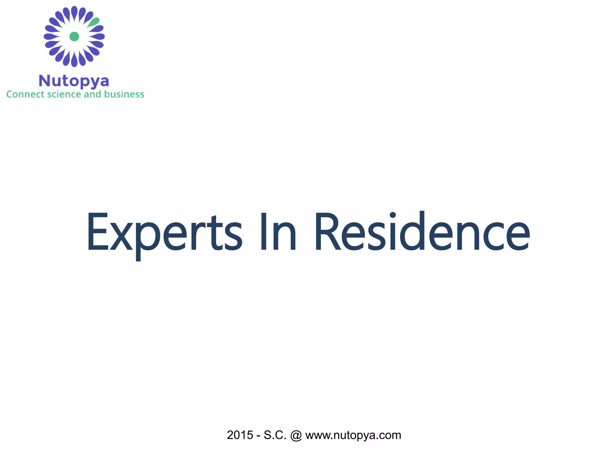 Nutopya connects academic bioentrepreneurs with experienced entrepreneurs and executives to help commercialize new technologies. They provide insights on finalizing business models, defining strategies, preparing fundraising campaigns, conducting market research, building management teams, and securing legal and financial support. Entrepreneurs-in-Residence can also take on interim leadership roles to build business plans, make strategic decisions, conduct fundraising, and build initial management teams. Executive-in-Residence provide consulting on designing business models, analyzing value chains, developing marketing and operations plans, assessing market constraints, and addressing financing needs.