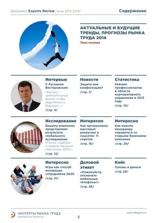 Дайджест зима 2013-2014 посвящен анализу актуальных трендов и прогнозов на рынке труда в России. Основное внимание уделяется влиянию кризиса на занятость, изменениям в управлении персоналом и новым мотивационным инструментам. Интервью с экспертом Русланом Вестеровским освещает ключевые вызовы и тенденции, такие как фриланс, гибкие графики работы и развитие HR-бренда.